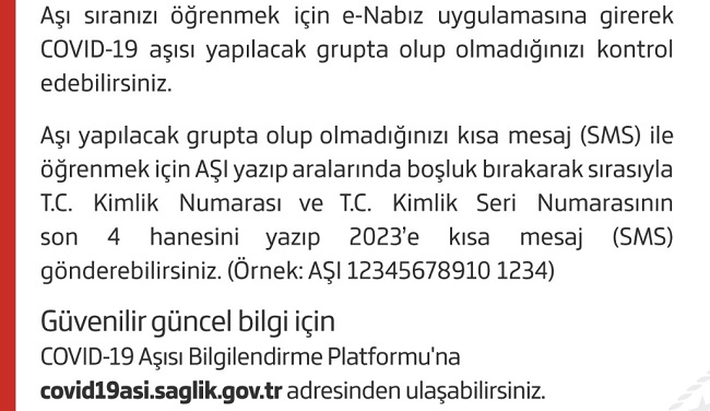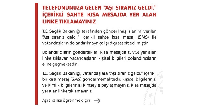 Sağlık Bakanlığı’nın konuyla ilgili önemli hatırlatması şöyle: ‘T.C. Sağlık Bakanlığı tarafından gönderilmiş izlenimi verilen “Aşı sıranız geldi.” içerikli sahte kısa mesaj (SMS) ile vatandaşların dolandırılmaya çalışıldığı tespit edilmiştir. Kısa mesajda yer alan linke tıklamayınız.