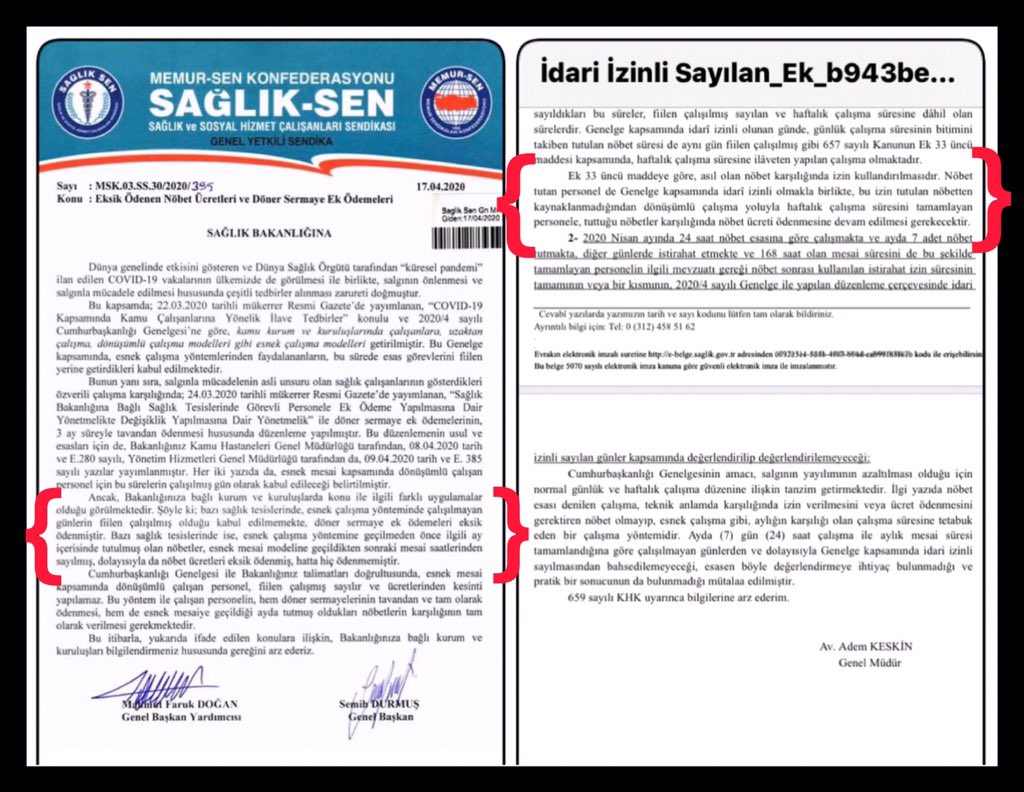 Sağlık-Sen Genel Başkanı Semih Durmuş konuyla ilgili sosyal medya hesabından bir açıklama yaptı. Sağlık-Sen Genel Başkanı Semih Durmuş'un bilgi paylaşımı şöyle: '17 Nisan’da “eksik ödenen nöbet ücretleri” konusunda Sağlık Bakanlığı’na yaptığımız itiraz haklı bulunmuştur. İdari izinler çalışılmış gün kabul edildiğinden dolayı nöbet ücretlerinin ödenmesine devam edilecektir.' dedi.