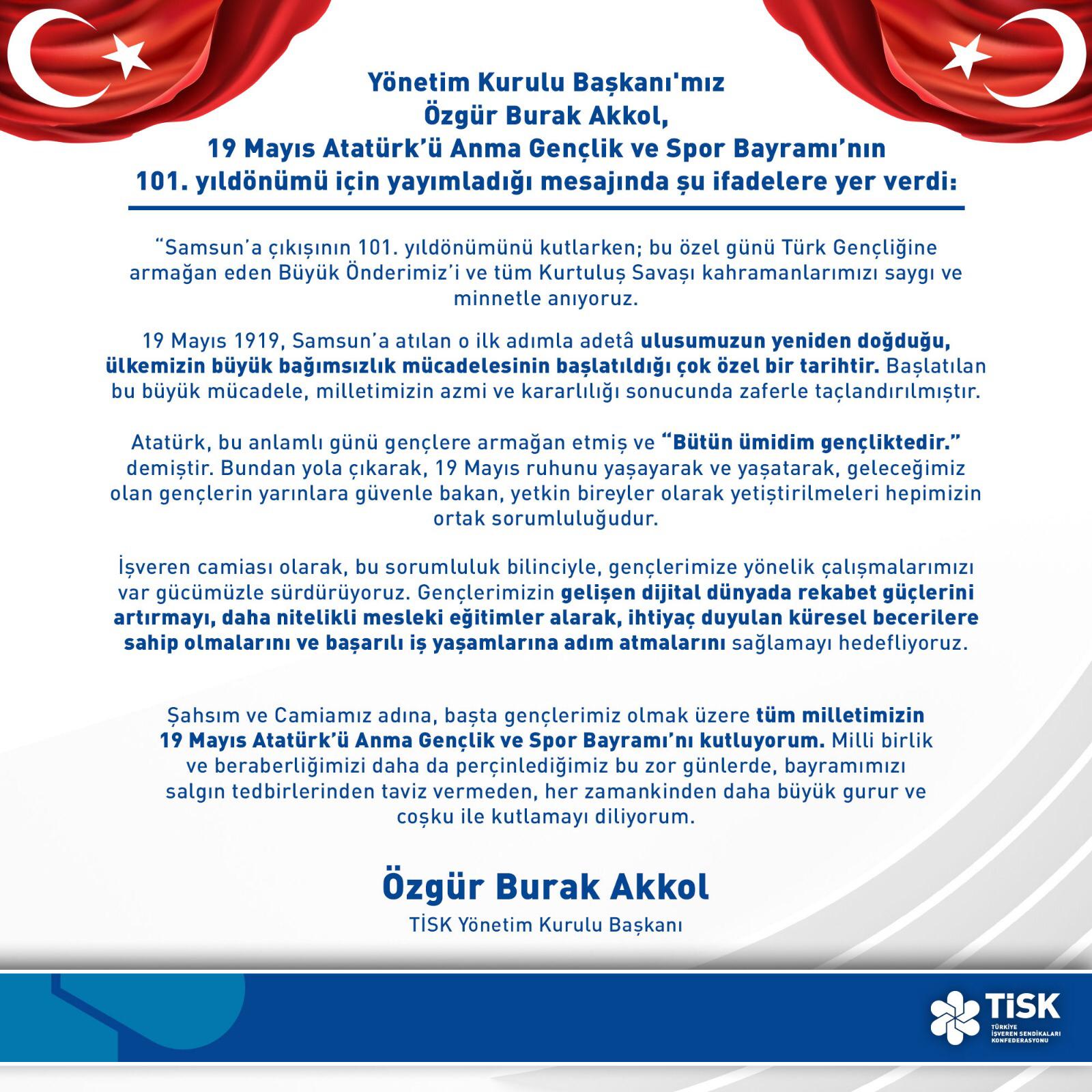 Türkiye İşveren Sendikaları Konfederasyonu (TİSK) Başkanı Özgür Burak Akkol, 19 Mayıs Atatürk’ü Anma, Gençlik ve Spor Bayramı'nın 101. yıldönümü için mesaj yayınladı. TİSK Başkanı Özgür Burak Akkol'un mesajı: